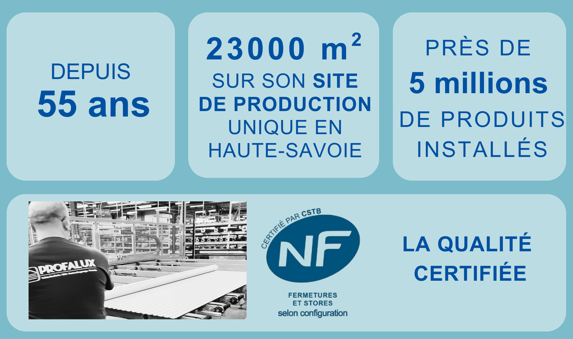 Fabricant français depuis plus de 55 ans, avec plus de 5 millions de produits installés, Profalux est reconnu pour son expertise en volets roulants, brise-soleil orientables, stores verticaux et portes de garage. La maîtrise de nos produits, depuis leur conception jusqu’à leur fabrication, nous permet d’apporter des solutions exclusives, adaptées aux chantiers : fiabilité des systèmes, conformité aux normes, performance produits, rapidité d’installation et confort d’utilisation.